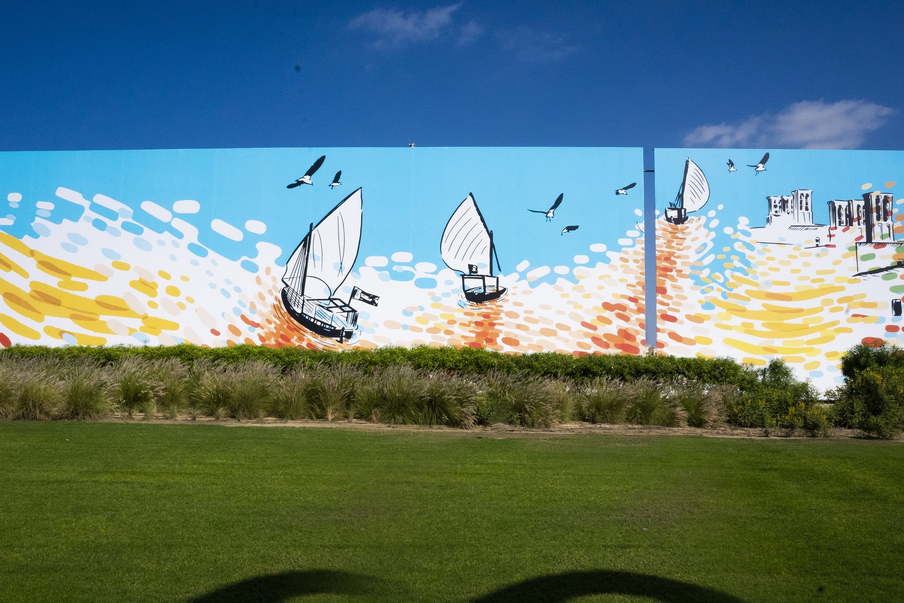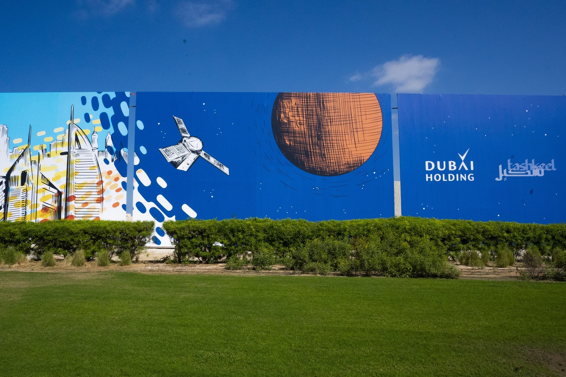 وباستخدام ثلاثة ألوان؛ الأزرق والأحمر اللذان يرمزان إلى البحر والصحراء والأخضر الذي يرمز إلى الاستدامة، يروي العمل قصة التطوّر المبهر الذي شهدته دولة الإمارات العربية المتحدة على مدار الخمسين عاماً ويضيء على العديد من مشاريع دبي القابضة وبصماتها التي ساهمت في نماء الإمارة ورسم معالمها، وذلك من خلال ستة إطارات للوحات رمزية، حيث تبدأ الحكاية مع مركب شراعي في إشارة إلى صيد اللؤلؤ وتجارته التي ساهمت في ازدهار الدولة والاستقرار فيها، ثم تشير اللوحة إلى بدء الزراعة، ليبدأ بعدها التطوّر الحضري، وظهور معالم الحداثة والنماء في المشهد الإماراتي، وصولاً إلى الإنجاز الأكبر بوصول مهمة الإمارات لاستكشاف المريخ، “مسبار الأمل”، إلى الكوكب الأحمر، والتي تعبّر عن رؤية الإمارات للمستقبل الذي ستواصل فيه مسيرة منجزاتها، ليس على المستوى الوطني وحسب، بل لما فيه خير الإنسانية جمعاء.