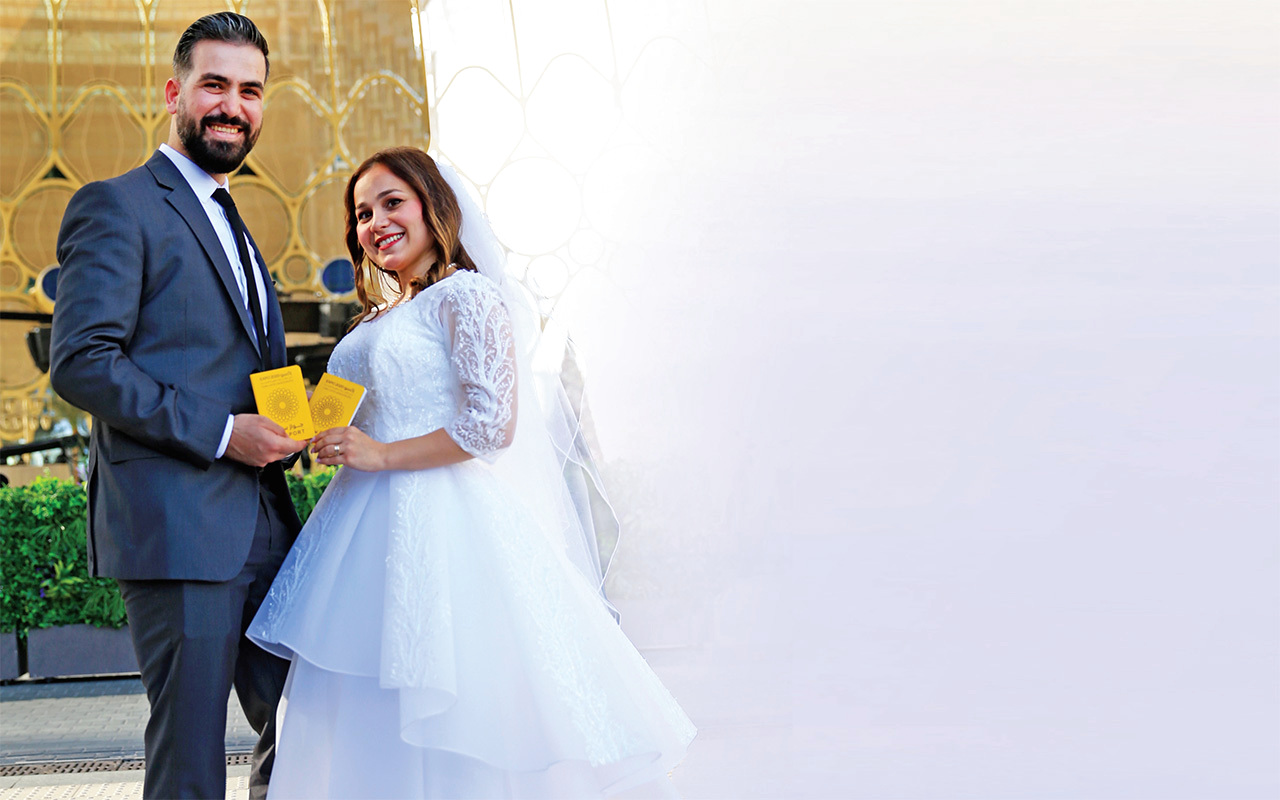 من جانبها، قالت العروس دانا عبيد: ولدت في العين ودرست فيها وحالياً أنا معيدة في كلية الصيدلة بجامعة العين، وأعتبر الإمارات بلدي الثاني، الذي نشأت وترعرعت فيه، وأول زيارة مع زوجي ستكون إلى جناح الإمارات تعبيراً عن شكرنا وتقديرنا لبلد الخير والعطاء والتسامح، بعدها سننطلق إلى زيارة العديد من الأجنحة وستكون محطتنا التالية جناح بلدنا سوريا، وسنوثق جميع الزيارات بختم جواز سفر «إكسبو 2020 دبي»، الذي يتميز بلونه الذهبي اللامع، ويعتبر وسيلة مميزة لتوثيق ذكريات زيارتنا إلى أجنحة الدول المشاركة في إكسبو.