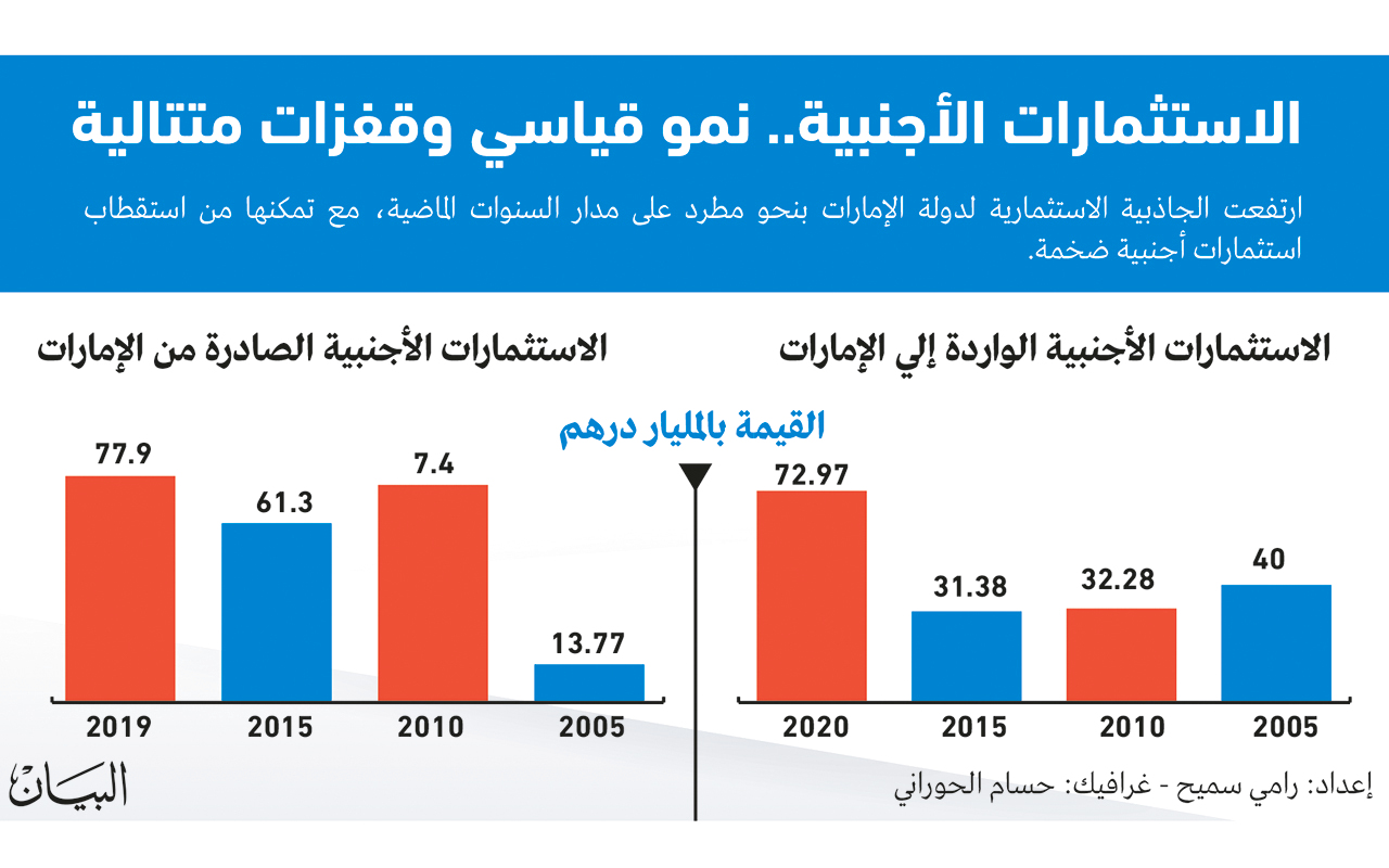 تبوأت الإمارات مكانة مرموقة على خريطة الاستثمار الإقليمي والعالمي، حيث هيأت بنيتها التحتية والتشريعية لتوفير بيئة استثمارية مرنة ومنفتحة وجاذبة للاستثمارات ورؤوس الأموال إلى جميع القطاعات، لترتفع قيمة الاستثمارات الأجنبية المباشرة الواردة إلى الدولة لأعلى مستوياتها على الإطلاق مسجلة 73 مليار درهم في 2020، رغم حالة عدم اليقين التي سادت الاقتصاد العالمي، وذلك بفضل نجاح الدولة في التعامل مع تحديات جائحة «كوفيد 19» والحد من تداعياتها.