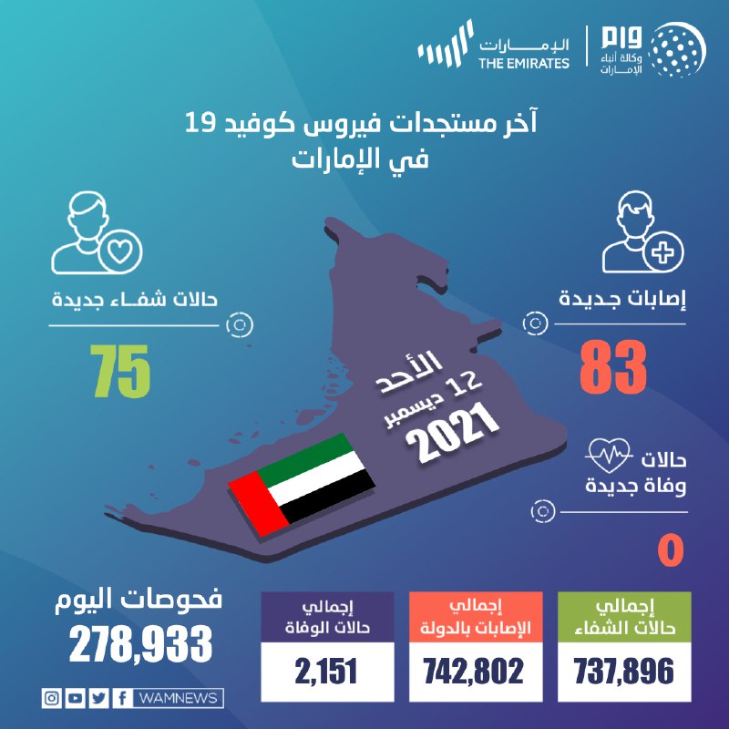 ‌‎وساهم تكثيف إجراءات التقصي والفحص في الدولة وتوسيع نطاق الفحوصات على مستوى الدولة في الكشف عن 83 حالة إصابة جديدة بفيروس كورونا المستجد من جنسيات مختلفة، وجميعها حالات مستقرة وتخضع للرعاية الصحية اللازمة، وبذلك يبلغ مجموع الحالات المسجلة 742,802 حالة.
