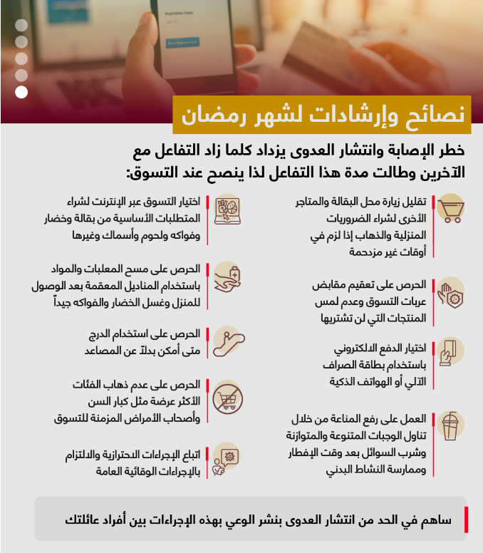 اعتمدت لجنة إدارة الطوارئ والأزمات في أبوظبي، وبالتعاون مع دائرة الصحة ومركز أبوظبي للصحة العامة، الإجراءات الوقائية لشهر رمضان المبارك والمتعلقة بالأنشطة الدينية والاجتماعية، حرصاً على الصحة العامة، وحفاظاً على سلامة جميع أفراد المجتمع.