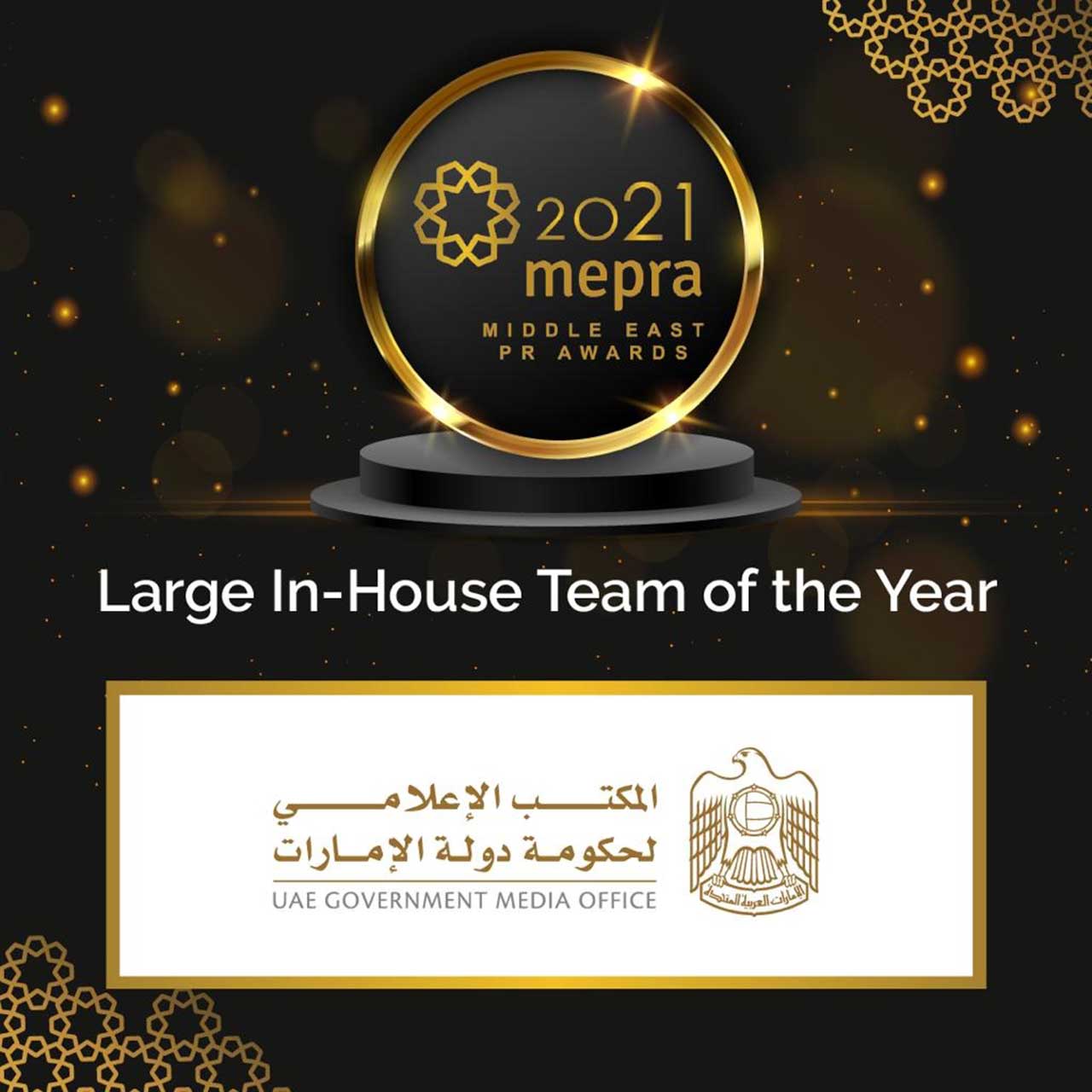 ونال المكتب الإعلامي جائزة “أفضل فريق داخلي في الشرق الأوسط ” لعام 2021 من جوائز “ميبرا” من قبل لجان الجائزة، التي تضم العديد من خبراء الاتصال الجماهيري والإعلام والتسويق المرموقين من أنحاء العالم، وذلك تكريماً للدور الحيوي الذي لعبه فريق الاتصال بالمكتب في إنجاح مختلف الحملات الإعلامية التي قدمها المكتب الإعلامي لحكومة دولة الإمارات منذ بداية العام الجاري وواكب العديد من المشاريع الحكومية الاستراتيجية مثل حملة “أجمل شتاء في العالم” و”أول عد تنازلي عربي” التي واكب وصول مشروع الإمارات لاستكشاف المريخ “مسبار الأمل” إلى الكوكب الأحمر، و”مشاريع الخمسين” الاستراتيجية التي أطلقتها حكومة الإمارات لتؤسس لدورة تنموية جديدة في مختلف القطاعات للخمسين عاماً المقبلة.