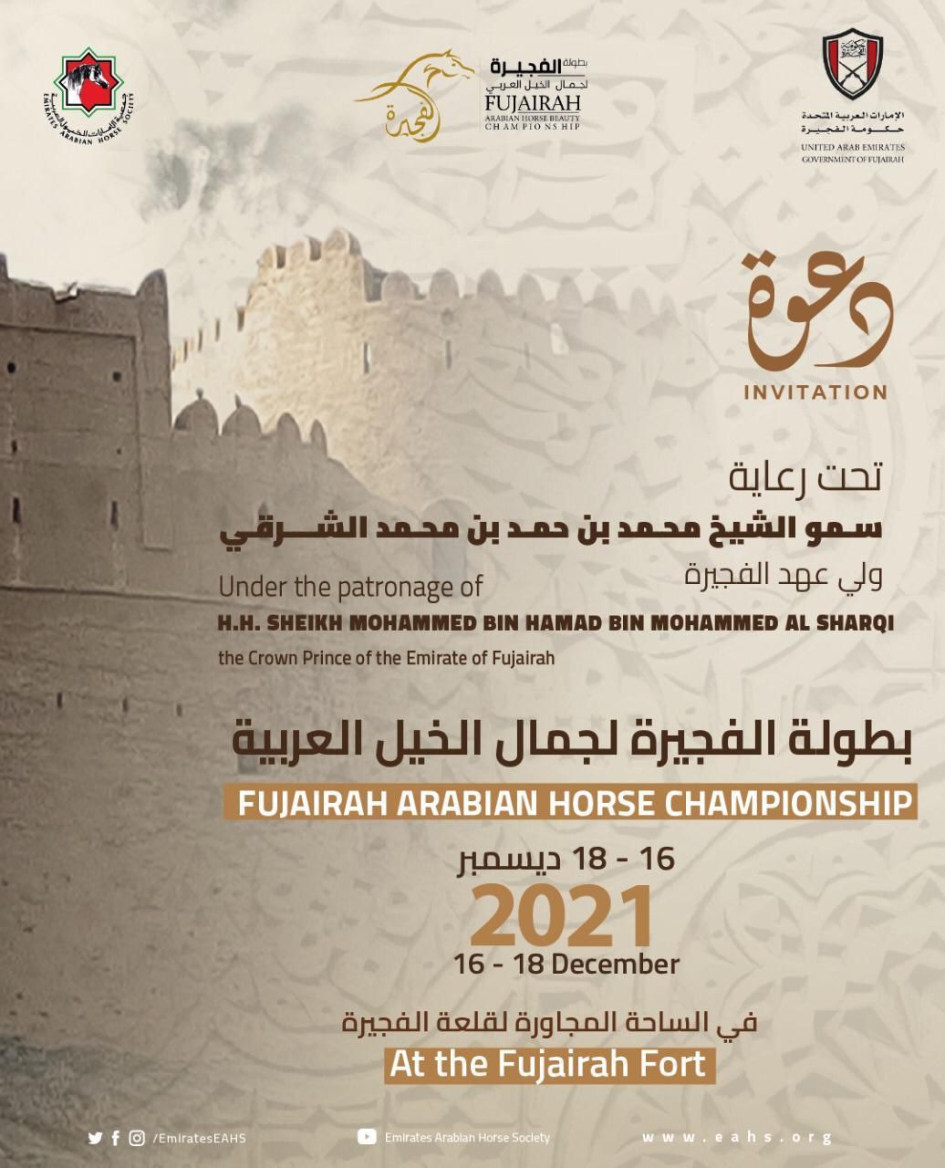 تحت رعاية سمو الشيخ محمد بن حمد الشرقي ولي عهد الفجيرة، تنطلق يوم غد الخميس فعاليات النسخة السادسة من بطولة الفجيرة لجمال الخيل العربية، وتستمر حتى 18 ديسمبر الجاري في الساحة المجاورة لقلعة الفجيرة.