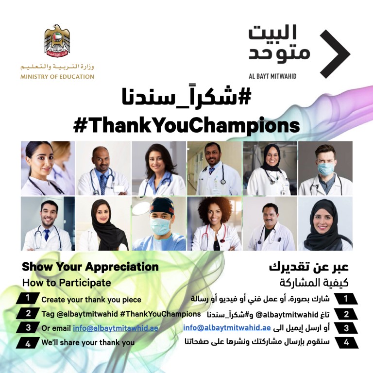 أطلقت جمعية البيت متوحد بالتعاون مع وزارة التربية والتعليم حملة ” شكراً سندنا “، تقديراً لجهود العاملين في قطاع الرعاية الصحية في دولة الإمارات وتفانيهم في حماية المجتمع ومواجهة تحدي انتشار فيروس كورونا المستجد “كوفيد 19” .