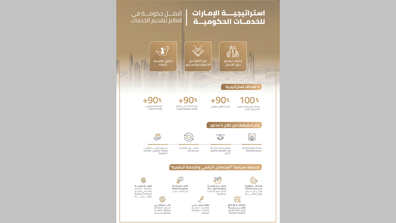 وتشمل محاورها تقديم خدمات رقمية تركز على الإنسان، وتصل للمتعامل في أي مكان على مدار الساعة، وتعزيزها بالتكنولوجيا، ورفع كفاءة القدرات الحكومية لموظفي الحكومة من خلال تطوير المهارات التي تتطلبها طبيعة وظائف المستقبل.