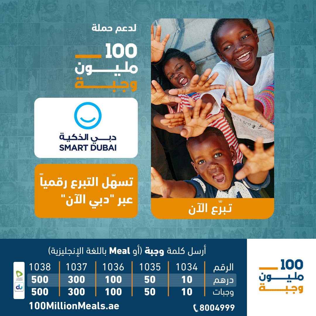 وتتعاون دبي الذكية مع “حملة 100 مليون وجبة” لتسهيل مساهمات المتبرعين من المؤسسات والأفراد وقطاعات الأعمال من داخل الدولة وخارجها لما فيه تسريع وصول الدعم الغذائي لمستحقيه من خلال إتاحة التبرعات عبر الموقع الإلكتروني للحملة وتطبيق “دبي الآن” من أي مكان وفي أي زمان.