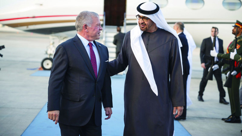 وكان الملك عبدالله الثاني بن الحسين عاهل المملكة الأردنية الهاشمية الشقيقة، وصل إلى البلاد أمس في زيارة أخوية. وكان صاحب السمو الشيخ محمد بن زايد آل نهيان، رئيس الدولة، حفظه الله، في مقدمة مستقبلي أخيه الملك عبدالله الثاني لدى وصوله والوفد المرافق بمطار البطين في أبوظبي. كما كان في الاستقبال، سمو الشيخ منصور بن زايد آل نهيان، نائب رئيس الدولة نائب رئيس مجلس الوزراء رئيس ديوان الرئاسة، وسمو الشيخ خالد بن محمد بن زايد آل نهيان، ولي عهد أبوظبي، وسمو الشيخ ذياب بن محمد بن زايد آل نهيان، نائب رئيس ديوان الرئاسة للشؤون التنموية وأسر الشهداء، وسمو الشيخ حمدان بن محمد بن زايد آل نهيان، والشيخ محمد بن حمد بن طحنون آل نهيان، مستشار الشؤون الخاصة في ديوان الرئاسة، ورئيس جهاز الإمارات للمحاسبة، حميد عبيد أبوشبص. ورافق الملك، خلال الزيارة، رئيس الوزراء الأردني الدكتور بشر الخصاونة، ومدير مكتب الملك، الدكتور جعفر حسان، وسفير الأردن لدى الدولة نصار الحباشنة.