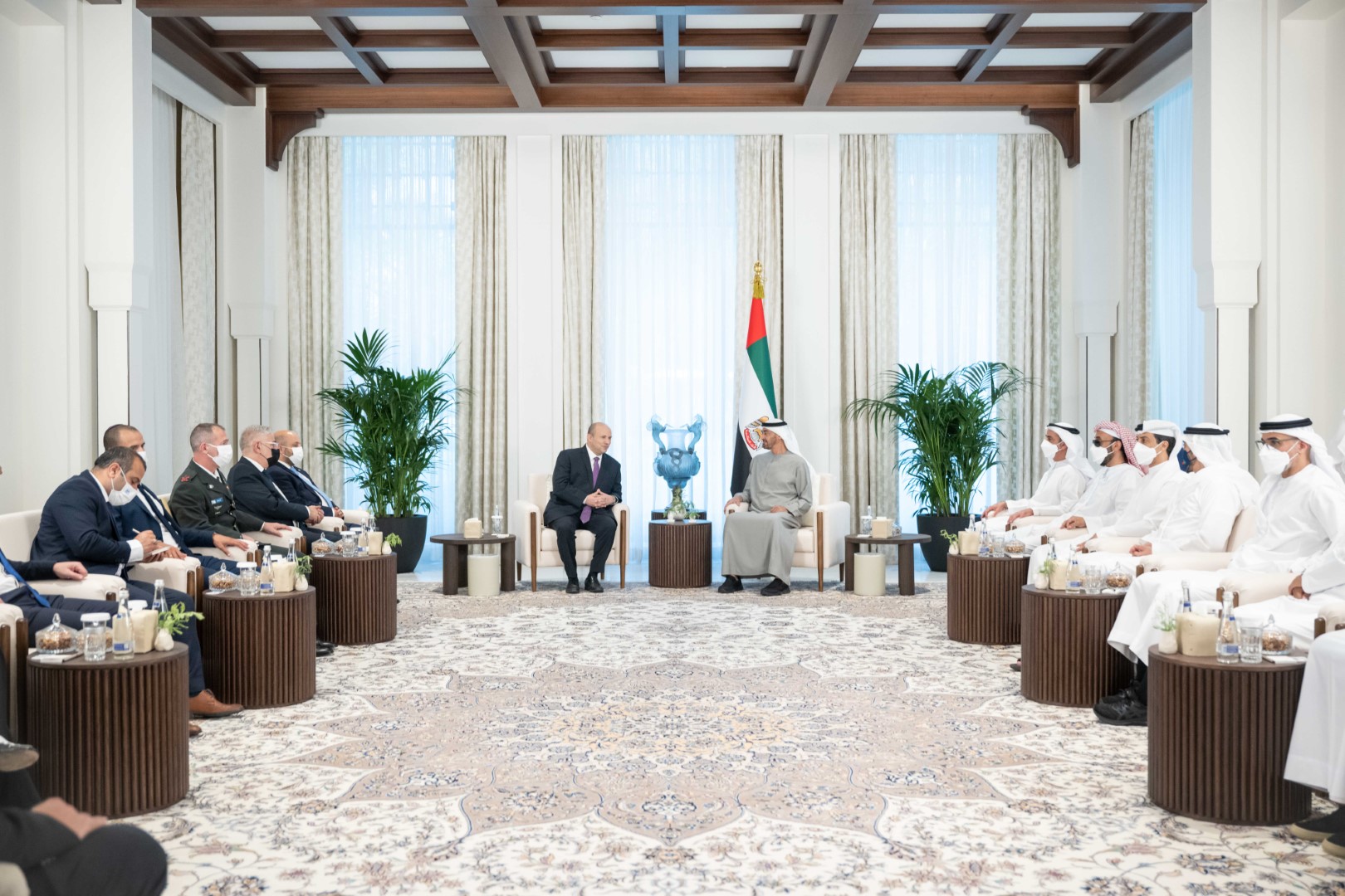 حضر اللقاء ..الفريق سمو الشيخ سيف بن زايد آل نهيان نائب رئيس مجلس الوزراء وزير الداخلية وسمو الشيخ طحنون بن زايد آل نهيان مستشار الأمن الوطني وسمو الشيخ منصور بن زايد آل نهيان نائب رئيس مجلس الوزراء وزير شؤون الرئاسة وسمو الشيخ عبدالله بن زايد آل نهيان وزير الخارجية والتعاون الدولي وسمو الشيخ خالد بن محمد بن زايد آل نهيان رئيس مكتب أبوظبي التنفيذي عضو المجلس التنفيذي ومعالي الدكتور أنور بن محمد قرقاش المستشار الدبلوماسي لصاحب السمو رئيس الدولة وعدد من المسؤولين والوفد المرافق لرئيس وزراء إسرائيل.