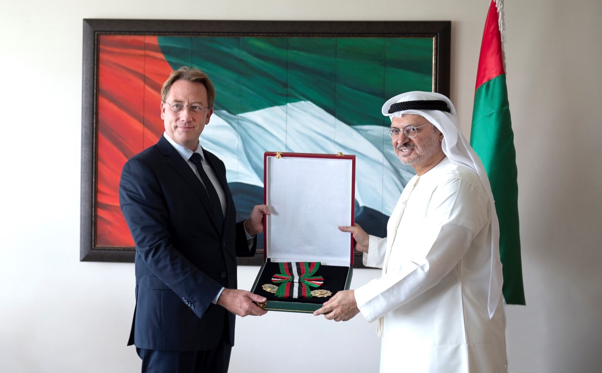 وقلد معالي الدكتور أنور بن محمد قرقاش وزير الدولة للشؤون الخارجية السفير الفرنسي الوسام خلال لقاء عقد اليوم ” الاثنين ” في ديوان عام وزارة الخارجية والتعاون الدولي.