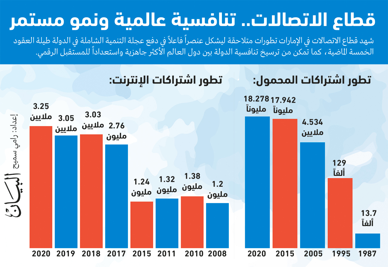 وأوضح التقرير أن اشتراكات خطوط الهاتف المتحرك في الدولة ارتفعت من 13.7 ألفاً في عام 1987 إلى 18.278 مليون اشتراك بنهاية العام 2020، بنمو بنسبة 133322% خلال 34 عاماً، فيما زاد عدد اشتراكات الإنترنت في الدولة من 1.202 مليون اشتراك عام 2008 إلى 3.245 ملايين اشتراك بنهاية 2020، بزيادة قدرها 170% خلال 13 عاماً.