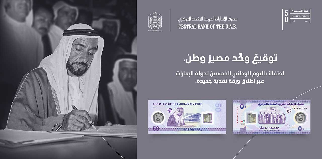شهد صاحب السمو الشيخ محمد بن راشد آل مكتوم نائب رئيس الدولة رئيس مجلس الوزراء حاكم دبي “رعاه الله” وصاحب السمو الشيخ محمد بن زايد آل نهيان ولي عهد أبوظبي نائب القائد الأعلى للقوات المسلحة وصاحب السمو الشيخ حمد بن محمد الشرقي عضو المجلس الأعلى حاكم الفجيرة وصاحب السمو الشيخ سعود بن راشد المعلا عضو المجلس الأعلى حاكم أم القيوين وصاحب السمو الشيخ سعود بن صقر القاسمي عضو المجلس الأعلى حاكم رأس الخيمة وسمو الشيخ سلطان بن محمد بن سلطان القاسمي ولي عهد ونائب حاكم الشارقة وسمو الشيخ عمار بن حميد النعيمي ولي عهد عجمان .. إطلاق مصرف الإمارات المركزي ورقة نقدية جديدة من فئة الــ 50 درهماً بمناسبة اليوم الوطني الـ 50 .. وذلك تخليداً لمآثر المغفور له المؤسس الشيخ زايد بن سلطان آل نهيان والرعيل الأول من حكام دولة الإمارات ” طيب الله ثراهم أجمعين ” ووفاء لتفانيهم وعرفاناً بدورهم التاريخي في توحيد الدولة تحت راية واحدة.