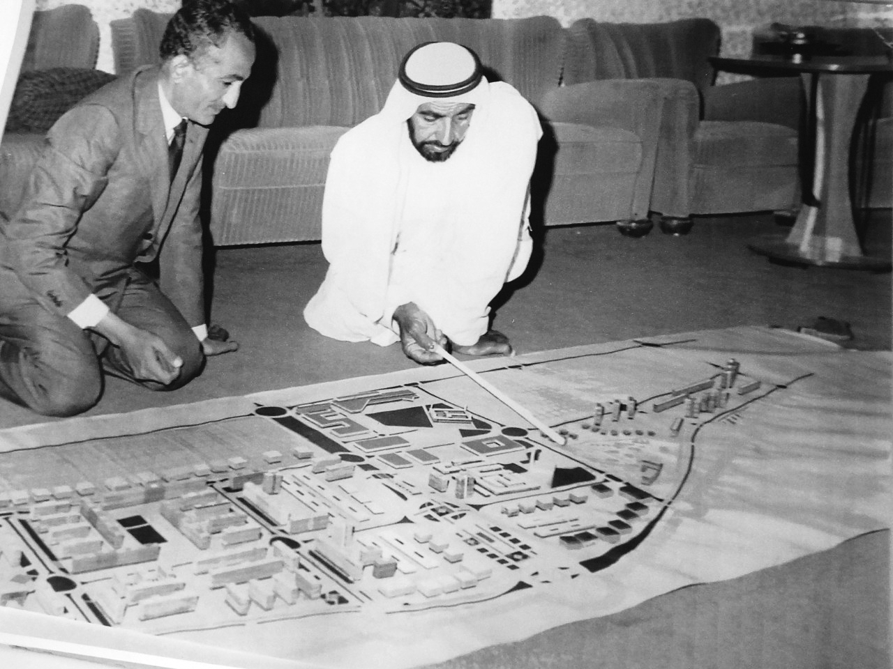 وعن أول لقاء له مع الشيخ زايد بن سلطان ذكر الدكتور عبد الرحمن مخلوف في كتابه إنه عندما رشحته الأمم المتحدة كخبير للتخطيط العمراني بناءً على طلب الشيخ زايد، وصل إلى أبوظبي يوم 2 نوفمبر عام 1968 حيث مكثت فيها شهراً يدرس تضاريس وجغرافية المدينة، وكان الشيخ زايد في ذلك الوقت خارج البلاد في جنيف، وبعد عودته التقى سموه بعد العصر في مكان بالقرب من فندق انتركونتيننتال، حيث اعتاد أن يقوم بالمرور بعد صلاة العصر على المشاريع العمرانية التي تنفذ في ذلك الوقت، ثم يجلس في نهاية المطاف في هذا المكان».