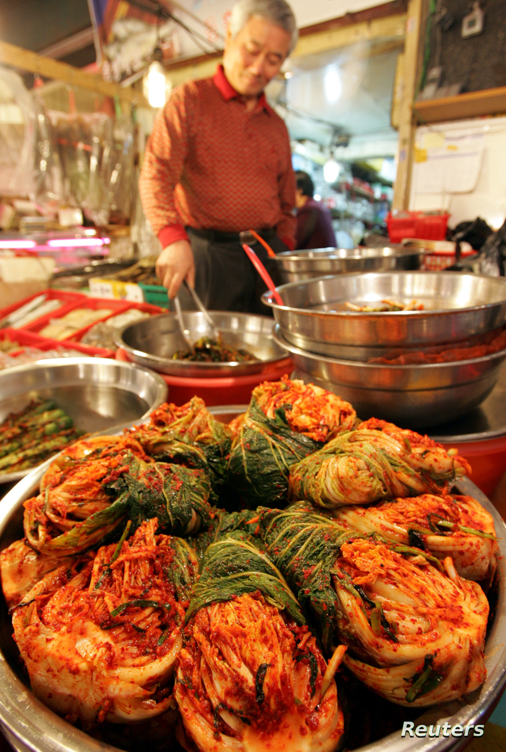A merchant arranges domestic kimchi made with South Korean cabbages at a market in Seoul October 27, 2005. South Korean concerns about how safe it is to eat kimchi are growing even though authorities banned imports of the spicy pickled dish from China last week because they may contain parasites found in human excrement. REUTERS/Lee Jae-Won