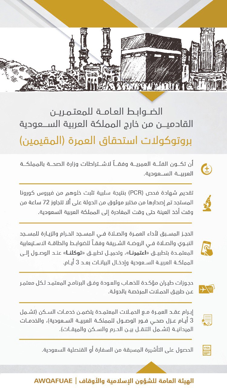 نشر الموقع الرسمي للهيئة العامة للشؤون الإسلامية والأوقاف، قائمة بالضوابط العامة للمعتمرين القادمين من خارج المملكة العربية السعودية، تضمنت 13 إجراءًا أو اشتراطاً يجب استفائها، بينها 6 “بروتوكولات” لاستحقاق العمرة على مستوى مواطني الدولة، أولها أن تكون الفئة العمرية وفقا لاشتراطات وزارة الصحة بالمملكة العربية السعودية، والثاني، تقديم شهادة فحص (بي سي آر) بنتيجة سلبية تثبت خلو الراغبين في أداء العمرة من فيروس “كورونا” المستجد، تم إصدارها من مختبر موثوق من الدولة (على ألا تتجاوز 72 ساعة من وقت أخذ العينة حتى وقت المغادرة إلى المملكة العربية السعودية).