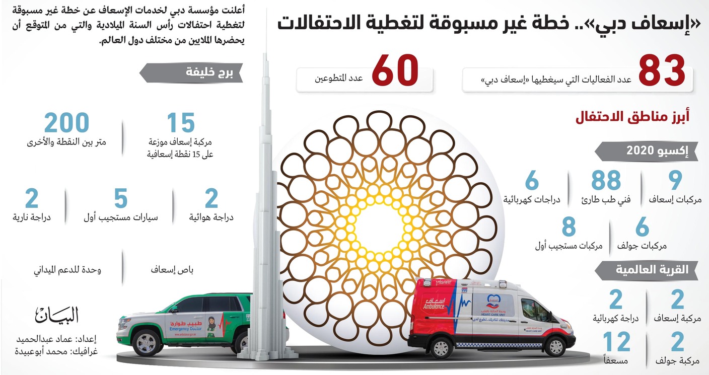 وبين الدراي أنه تم تخصيص 11 نقطة إسعاف إضافية تم توزيعها على مختلف المناطق الأخرى بالإمارة مثل جبل علي وبر دبي والمناطق الخارجية وديرة، ويصل عدد مركبات الإسعاف المخصصة لهذه المناطق 13 في الميدان من دون الفعاليات ومجموع الطاقم الطبي 600 ومجموع المشرفين 25 مشرفاً.